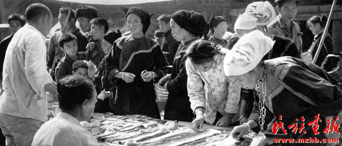 1980年,全國民族地區落實黨的民族政策,切實尊重少數民族的傳統習慣,轟轟烈烈地恢復民族傳統集市,以最短的時間恢復生產、發展自由貿易、豐富群眾生活。圖為貴州苗族農村市場開始活躍起來《民族畫報》1982年第1期