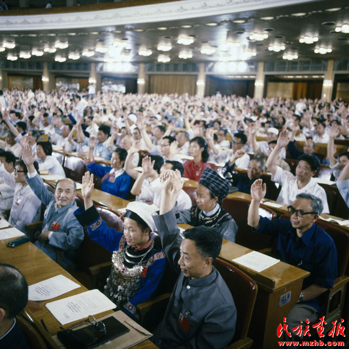 1984年5月31日,中華人民共和國第六屆全國人民代表大會第二次會議通過了《中華人民共和國民族區域自治法》,自1984年10月1日起施行。民族區域自治制度是我國的一項基本政治制度。圖為各族代表舉手表決通過《中華人民共和國民族區域自治法》《民族畫報》2009年慶祝中華人民共和國成立60周年???/p>