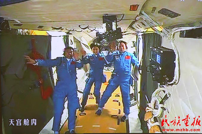 2012年6月18日,神舟九號飛船與天宮一號完成自動交會對接,兩飛行器形成穩定運行的組合體后,三位航天員先后進入天宮一號目標飛行器,這實現了中國載人航天歷史上首次對一個在軌運行的航天器的拜訪和駐留。圖為在北京航天飛控中心大屏幕拍攝到的航天員景海鵬、劉旺、劉洋在天宮一號實驗艙內的畫面。《民族畫報》2012年第7期