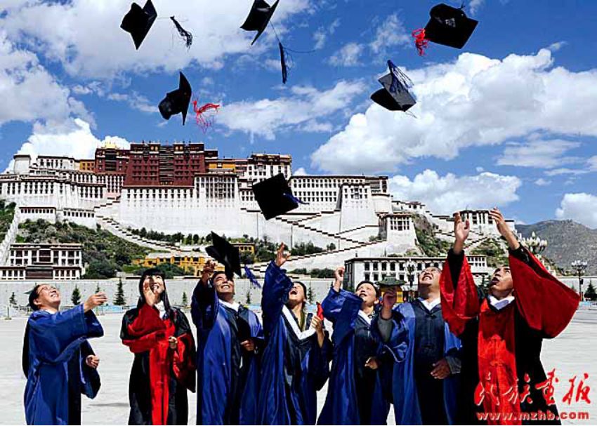 西藏已有普通本專(zhuān)科學(xué)校7所。西藏大學(xué)一批被授予博士、碩士學(xué)位的學(xué)生在布達(dá)拉宮廣場(chǎng)慶祝畢業(yè)