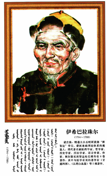 伊希巴拉珠爾(1704~1788),蒙古族,一名也協(xié)班覺、額爾德尼班智達·松巴堪布,蒙古衛(wèi)拉特人,著名蒙醫(yī)學家、文學家、天文學家哲學家。一生著作豐厚,其中對完善蒙醫(yī)理論體系有重要影響的著作有《甘露之泉》、《白露醫(yī)法從新》、《甘露點滴》、《甘露匯集》和《認藥水晶鑒》,在這些著作中他將藏醫(yī)學理論與蒙古人的體質(zhì)、生活習俗、居住地區(qū)的地理、氣候條件等具體實際結(jié)合在一起,進行創(chuàng)造性的理論研究,不僅豐富了臨床實踐的內(nèi)容,而且補充和完善了蒙醫(yī)學的理論體系,他將傳統(tǒng)蒙醫(yī)學“寒熱理論”與《四部醫(yī)典》中關(guān)于寒熱病理論的闡述進行有機結(jié)合,使之成為近代蒙醫(yī)學病性辯證的總綱,同時,他也闡述了將六基癥作為病因鑒別診斷的核心及其臨床表現(xiàn),使“六基癥”學說從理論到實踐都獲得了比較系統(tǒng)的發(fā)展。占布拉道爾吉是19世紀著名的蒙藥學家,他編著的《蒙藥正典》(又名嗚嗚蒙藥圖鑒)共收載蒙醫(yī)臨床常用藥物879種,按礦物、植物和動物等分為8部24類,附插圖576幅,對每種藥物的產(chǎn)地、形態(tài)、性味、功能、入藥部分、采集加工、炮制方法、主治、用法等都闡述詳盡,并且每一味藥物都標寫了蒙、藏、滿、漢四種文字的藥名,具有很高的參考價值。該書還附有外科術(shù)療器具圖解,以及放血穴位、針灸穴位、人體各部分劃分圖解說明等。敏如爾古布拉(1789-1838)編撰了蒙醫(yī)學方劑巨著《方海》,是一部比較系統(tǒng)完整的蒙醫(yī)藥物方劑學經(jīng)典著作,收載方劑近200種,分為76章,進行詳盡的論述和評點,同時對相關(guān)疾病的病因、病機、分類和治法等也做了簡要論述。
