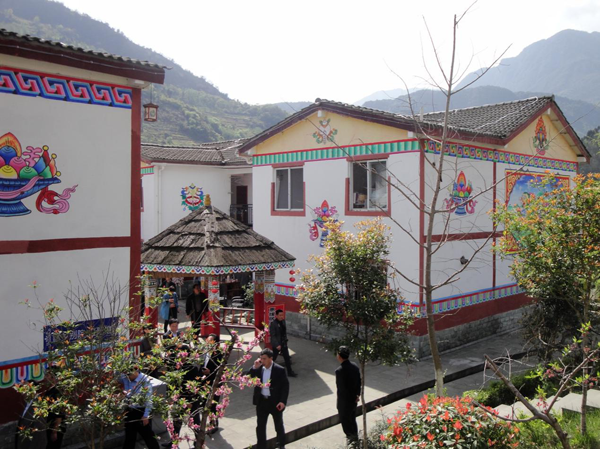 行走在鄉間小道上,別樣的唐卡畫、雕龍畫鳳房檐鑲嵌在房屋之頂,讓人如入人間仙境陶醉其中。沿著整潔的水泥路,穿過一座座古香古色的農家房屋、木制籬笆院,來到農戶門前,整潔亮麗的房屋屹立在寬敞的庭院內,太陽能浴室、現代化廚房、干凈的衛生間展現在眼前。