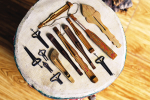 安宇歌介紹,口弦都是純手工制作的,最難制作的部分是能發音的中簧。制作中簧時,選取原料須是圓形鋼絲,先要將其砸扁,兩邊是尖的,整個簧的距離由寬到窄,窄的部位向上折彎成鉤,留兩公分長度,再折一小鉤。并且,中簧需高溫淬火,這是一個難度極高的環節,全憑手感。如簧不淬火便會彈性不好,淬過了頭則一彈就碎,淬不到位會導致彈撥口弦時所發的聲音不佳。從某種程度上講,用口弦彈奏的音樂之所以引人側耳,關鍵就在這根中簧上。