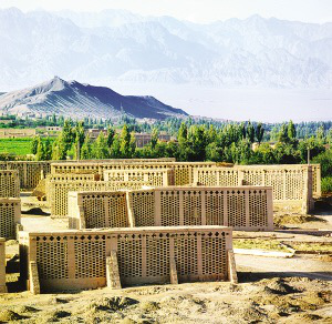 吐魯番曬葡萄干的“陰房”。這里處于我國海拔最低的盆地,也是維吾爾族聚居區,冬冷夏熱,民居既要防寒又要防暑。吐魯番盛產葡萄,每戶皆有曬葡萄干的陰房,因此,住房與陰房合一的民居成了吐魯番的特色。大的陰房都集中建在山坡上,以利運輸,小的陰房