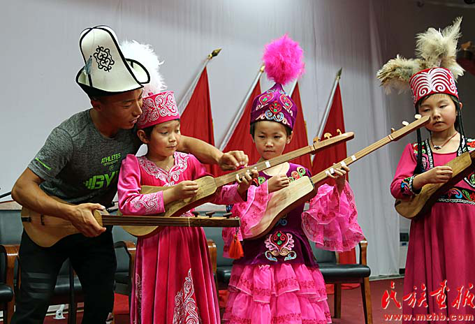 離開工作室,記者們來到了鄉里的文化站,10多個柯爾克孜族孩子正在學彈庫姆孜。站在一旁教學的老師是來自新疆師范大學大四的學生沙力哈爾別克·玉山巴依,學習音樂專業的他每年暑假都會回到自己的家鄉色帕巴依,為孩子們教授庫姆孜。他對記者說:“每次回家我都能感到孩子們對學習民族樂器的渴望。鄉政府也特別支持我,提供場地和經費,能為孩子們教自己本民族的樂器,我也很高興。”