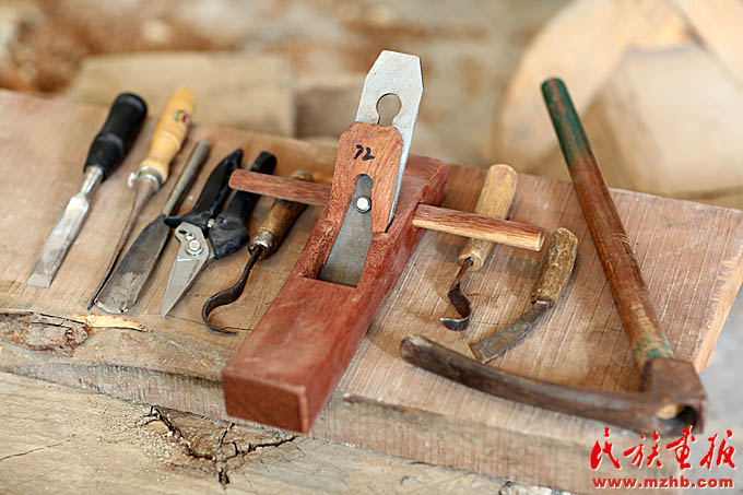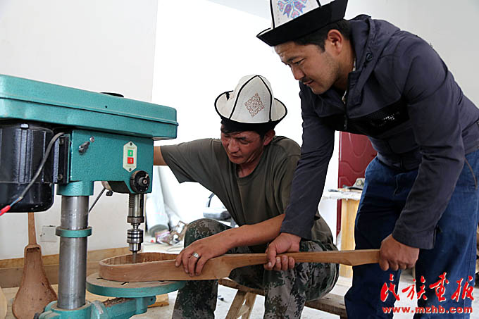 這間工作室的主人叫阿吉別克·買買達洪,主人恰巧有事外出,他的弟弟,年輕朝氣的吾蘭別克張羅著給記者們當起了翻譯。正忙活著打磨樂器的小伙叫木沙,今年31歲,問起庫姆孜的制作工藝,他才把頭抬起來,笑著說:“我做這個十年了。一把庫姆孜,往往琴身是杏木,蓋子是松木。杏樹、松樹木切割后放在干燥的地方,一兩年后才能用。”庫姆孜有三根弦,琴弦以前用動物的腸子手工自制,現在有的工匠開始使用現成的弦。判斷庫姆孜手工藝人手藝高低的關鍵何在?木沙解釋說,“要看彈出來的聲音。木頭的原料不同,出來的聲音也不同。”這個回答似乎也隱藏了手工藝人的絕活所在,可意會不可言傳的技藝,往往在一代代的工匠手中以師徒親授的方式傳承。