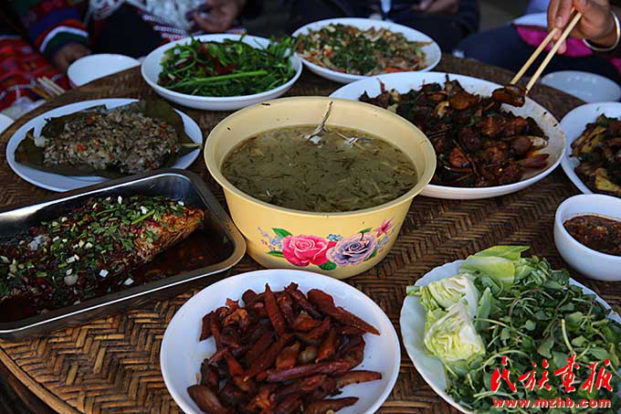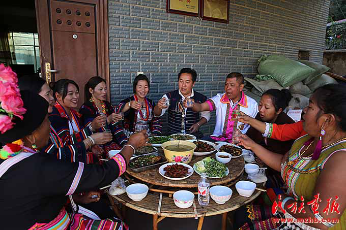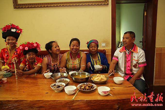 在曼夕村,民族傳統節日已成為不同民族間聯絡增進感情的最佳時機。曼夕村村主任車達告訴記者,他自己是哈尼族,村里還有漢、布朗、哈尼等民族。40多年前,為了種植橡膠樹布朗族與彝族遷徙過來生活在一起,幾十年來,兩個民族相互尊重對方的生活習慣,過年過節相互走動拜訪,互相通婚成為一家人。晚飯時,記者在曼夕村村支書巖坎硝家里聚餐時看到車達帶著幾個哈尼族婦女盛裝出席,宴會上人們相互祝賀,唱敬酒歌。哈尼族婦女圖處告訴記者,哈尼族過傳統節日,布朗族村民要來慶賀,布朗族過節,哈尼族人也去祝福,幾十年來一直如此。