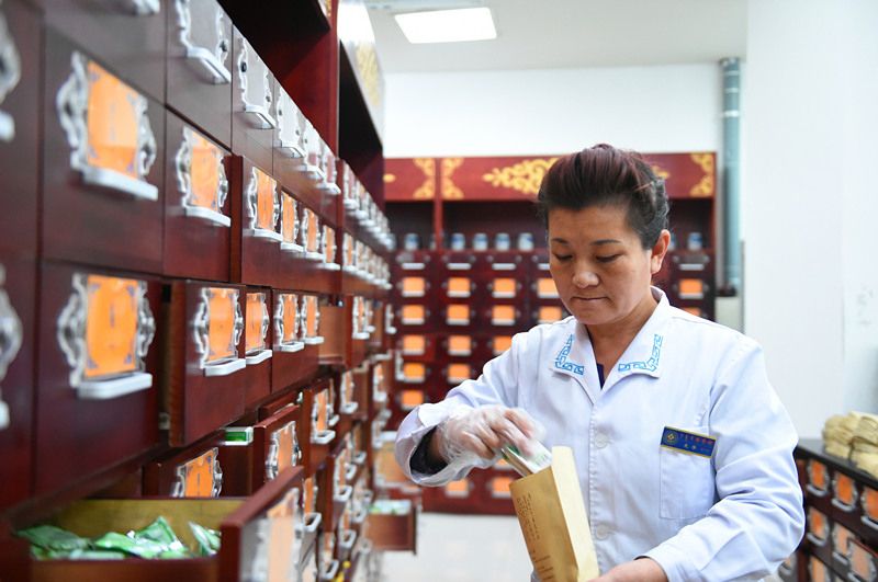 內蒙古國際蒙醫(yī)醫(yī)院蒙藥師在藥房抓藥