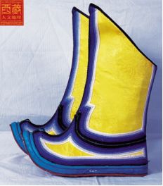 西藏高原地域遼闊,每個地區都有屬于自己的鞋子。藏族男女鞋,外觀雖然很像舞臺上古裝戲里穿的靴子,但用牛皮做底,底高二寸,腰高至小腿之上,鞋面用紅綠相間的毛呢裝飾,鞋腰也有線條、花紋,鞋幫用各色絲線或各色皮革、氆氌、金絲緞制成。人們能從一個人所穿的鞋子判斷出一個人的職業和社會階層。