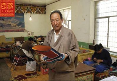 坐在工作臺上的赤列塔青,身材高大,穿一身合體的淺色藏裝,前擺上沾著幾星鼻煙,長期用針的手指有些變形。翻開他的履歷發現,赤列塔青可以說是拉薩少有的制靴世家,他的父親邊巴頓珠在舊社會是個給人支差的貧苦鞋匠,靠給有錢人修鞋、做鞋為生。今年68歲的赤列塔青性格沉穩、做事穩健,他12歲當學徒工,做鞋做了56年,如果再加上父輩的修鞋歷史,時間更長。在今天的拉薩有這樣經歷的人算是屈指可數了。赤列塔青從小就在父親和師傅身邊打下手,逐漸掌握這個足以養家糊口的一技之長,終于成長為一個勤奮而多才的手工藝人,開始了穩坐一隅的匠人生涯。
