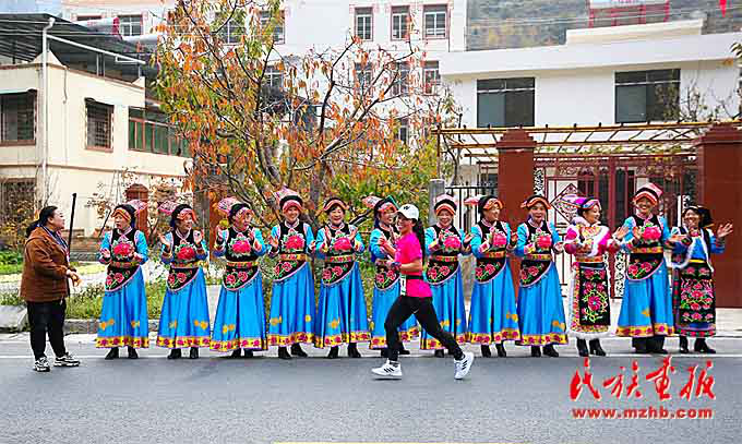 運(yùn)動員們在奔跑中感受熱熱鬧鬧的羌?xì)v年,體驗節(jié)奏明快的沙朗舞,近距離接觸古樸厚重的羌族文化。