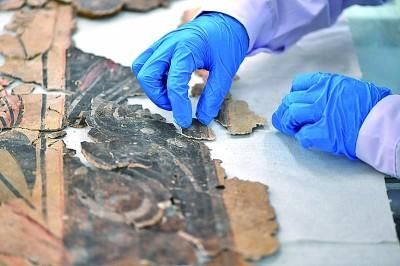 在山西大同云岡石窟研究院壁畫文物修復室,工作人員在進行壁畫修復。新華社發