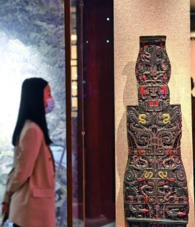 在位于北京的恭王府博物館內,觀眾在參觀展出的九連墩浮雕十弦琴。新華社發