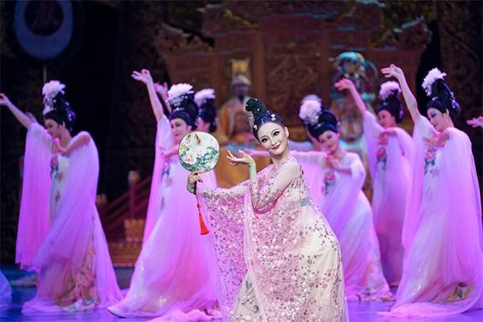 該劇在情感敘事和舞蹈語言上,采用“意中生象”“象中達意”的方式,從細微處融入唐代各地域各民族文化元素,凝練舞劇藝術品質:如取李白“醉入胡姬酒肆中”詩意演繹《胡姬舞》;取唐代畫家周昉《簪花仕女圖》畫意演繹《簪花舞》;取唐代畫家張萱《搗練圖》筆意演繹《搗練舞》;取王維“大漠孤煙直,長河落日圓”詩意生發《西涼武舞》等。在劇情發展和戲劇沖突中,設計符合人物性格的“獨、雙、三”主題舞段:凸顯西域風情的《胡旋舞》、表現曲江踏春的《采桑舞》和展示教坊舞技的《白纻舞》等情景舞段,展現了鮮明的民族文化交融特征,實現了中國傳統文化跨越時空的當代表達。