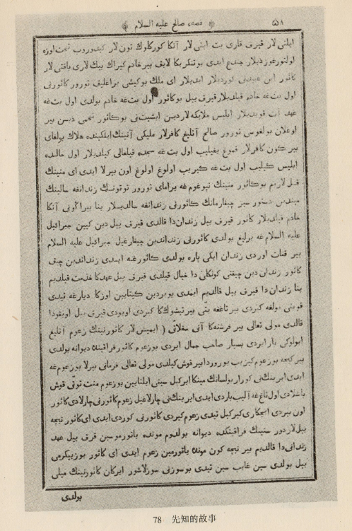 察合臺文著作。1899年喀山大學鉛印本。高25.5厘米,寬17.5厘米,共510頁。作者拉布古孜,寫于14世紀。圖為《先知薩立哈故事》中的一頁。寫的是異教徒們在魔鬼的支使下將要成為先知薩立哈的父親卡斯瓦爾關進地牢,天使奉真主之命使他逃出后與妻子見面的故事。現藏新疆博物館。該書語言豐富生動,屬哈喀尼耶語(后期回鶻語)和察合臺語之間的過渡語言,一定程度上反映了當時的口語,是研究維吾爾語言史和文學史的重要資料。