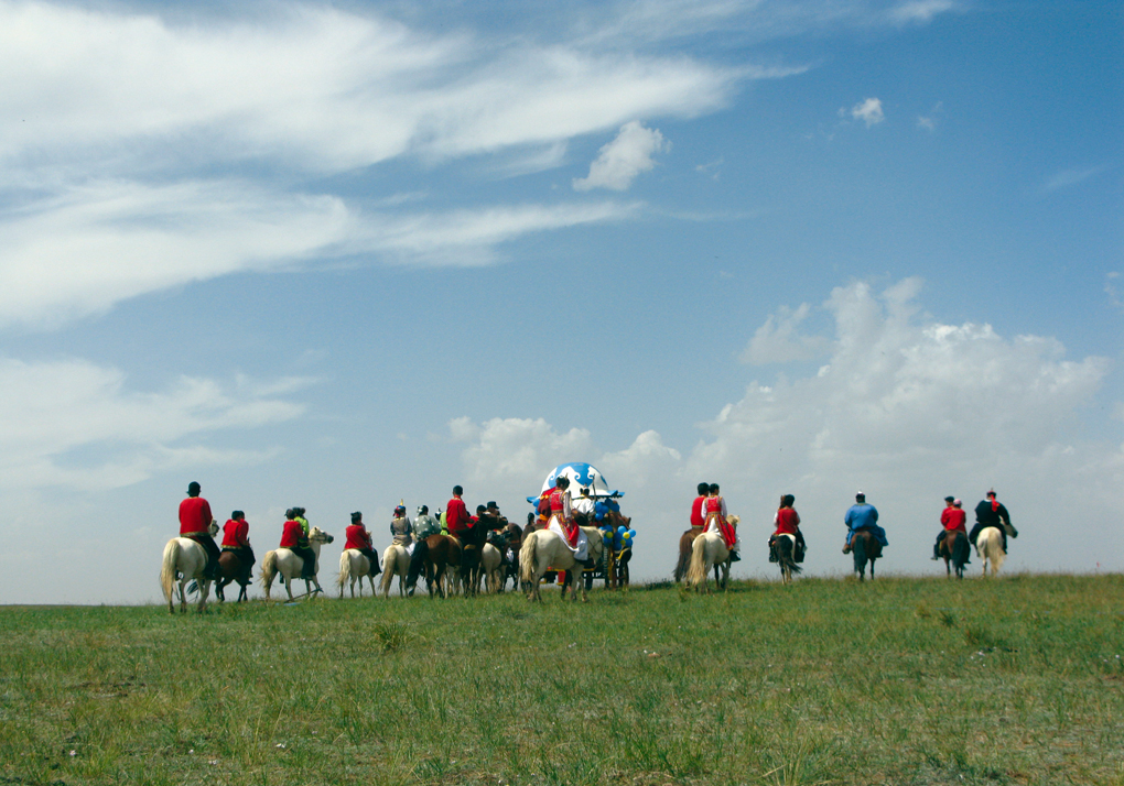 女方家最盛大的婚宴就要開始了。宴畢,新娘就要出嫁。所以也稱“離娘宴”。同時也意味著新郎要迎接最后一道過關考試。先輪流給賓客叩頭敬酒,接受女方家親戚贈送的衣服佩飾,穿上才可以娶走新娘。進膳時,新郎必須當眾掰開一個半生不熟的羊脖子,一般羊脖子里總要塞根紅柳棍,以考驗新郎的腕力和智力。宴后,新娘就要登程,女友們把新娘團團圍住,進行“阻嫁”,男方奮力搶親。之后,開始裝扮新娘。館頭額吉解開新娘的大辮,蘸著碗里的清水,梳得油光凈亮,把鏈垂頭飾戴上,意味著少女時代就此結束,今后將以少婦的形象出現。女方送親的人準備好騎乘,在悠揚的禮贊聲中,蒙著紅紗的新娘由倆位胞兄牽著,緩緩穿過人群上了紅馬,向婆家走去。這時,女方賓客唱起惜別的歌為她送行,直唱得新娘淚如雨下,不時地停馬回望【圖為四子王草原接新娘馬隊,趙文耀攝】。