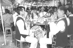 接著婚宴開始,八音隊吹奏的樂曲優美動聽,大家喝喜酒祝賀新郎、新娘;同時,男方家的帶娘給女方家人開檳榔碗。開檳榔碗的順序是女方家人由老到小分別接檳榔碗,意在感謝女方長輩、親屬對新娘的養育之恩。