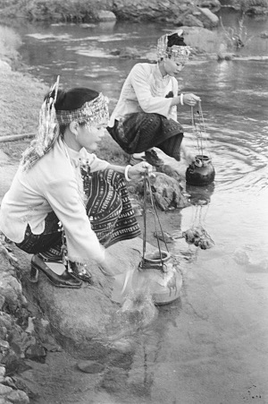 據說過去的黎家風俗是新娘挑滿水缸后,就與新郎、伴娘一起到河里網魚、摸螺。邊摸螺,邊唱山歌。伴娘和姐妹們會把新郎拉來嬉水,伴郎與阿哥們也不甘示弱,也向伴娘和姑娘們嬉水,你澆過來我澆過去,姑娘小伙樂陶陶。因此,保亭黎族嬉水節便是從婚俗引發出來的又一歡樂節日。