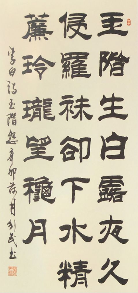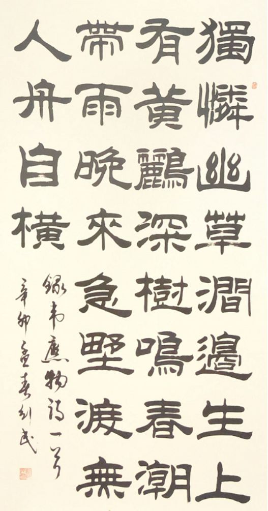 張行民的書法作品博覽眾家之長,悉心揣摩隸書之要義,領悟其精髓,加入其心志與感悟,漸漸形成了自己的風格。他的作品灑脫飄逸,體骨厚重,參合有各派書體的筆意,同時又有自己個性和意境的張揚,字體端莊英武,體象收放凝度。賞其書法,總能給我們一種“渾然陣列,筋道玉骨”的美感,實屬不可多得。