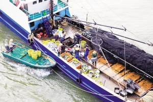 小快船靠上捕魚歸來的大漁船,收購、轉運海鮮漁獲(2014年攝)。