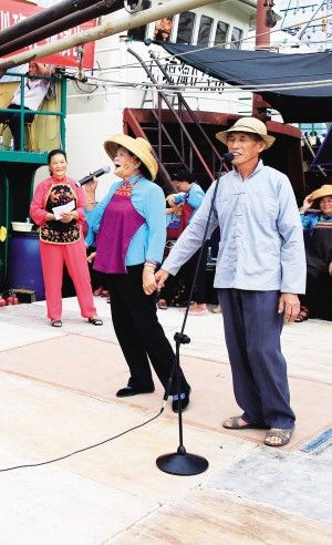 三亞疍歌傳承人代表張發結(右)在漁船上演唱疍歌(2014年攝)。