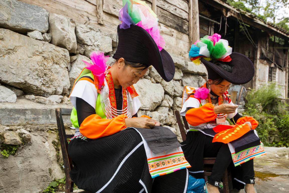 而批林村的女子傳統服飾較之男子則略顯復雜。批林村女子上衣以短袖開衫服飾為主,短袖開衫服飾顏色多變。在短袖開衫上還需戴上刺繡而成的背牌,背牌分為兩扇,一前一后。后背牌較大,但較短。前背牌較長,長至腰,背牌系帶上繡有圖案,以花草為主,顏色多變,前背牌需要用腰帶系住。批林村年輕女子在背牌之上還會帶上銀飾,胸前銀飾以銀圈為主。后背則是一串圖案銀飾,圖案多花草。除了前后背牌有銀飾外,前后背牌系帶上也有圓形雕花銀飾。批林村女子下裳則是以百褶裙為主,百褶裙顏色多以黑色為主,在下裙擺繡以白邊。百褶裙前還有系有兩層黑色圍腰,身后有三條彩帶自腰間垂下,垂至小腿。彩帶顏色亮麗,圖案優美。批林村女子頭飾是用六米長的青褐布折成,形式像一只船,稱為百褶帽,常用重大節慶,一些女子還會在百褶帽上繡上彩巾。