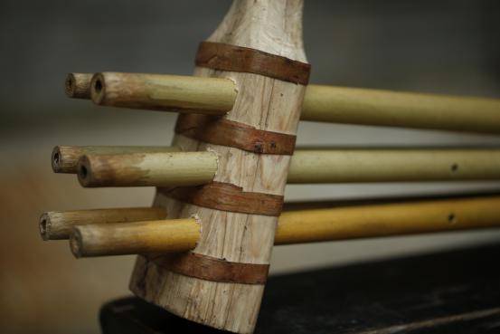 笙斗:又稱氣箱,多用杉木、松木或梧桐木制作。以杉木最佳,紋理順直、質(zhì)地松軟、少疤節(jié),外觀呈紡槌形,長46-56厘米、寬4-9厘米、高3.5-8厘米,細(xì)端再接一根長15厘米左右、外徑1.8厘米左右的竹管為吹口。制作時,將整塊毛坯料從中破為兩半,分別挖掏出內(nèi)膛,待裝入笙管后再用膠粘合,外部用細(xì)篾箍五至七圈而成。笙斗呈淡黃色,外部涂飾桐油,木紋清晰,外表美觀,故有“金蘆笙”譽(yù)稱。