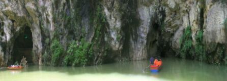 水洞長1000余米,半是人工半天然,登舟入洞,借助稀疏的燈光和導(dǎo)游的手電筒辨認(rèn)著一處一處各各不同的景物,頗有一點(diǎn)神秘之感。洞盡船出,豁然開朗,但見茂竹修篁叢叢簇簇,一泓綠水微波不興,野趣天成,靜謐無聲,此處名“竹林翠溪”,宛如一世外桃源。旱洞共三層,滿布著形態(tài)各異的石鐘乳、石筍、石柱、石幔,其第三層洞廳軒敞,一座天然石橋飛架兩懸崖間,人稱“奈何橋”,橋下即是深不可測(cè)的陰潭,景觀之奇特,令人叫絕。旱洞出口處,有苗寨一座,是專為旅游者興建的,游人盡可在此親身體驗(yàn)一次苗家的婚俗。