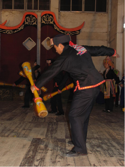 長鼓舞,是瑤族民間的傳統舞蹈,流傳年代久遠。《評王券牒》多有記載,瑤族人民很早就有踏歌擊長鼓而舞的習俗。桂北、湘南瑤區,在民間留存的碑刻中,也有瑤族“擊長鼓”的記載,進入明、清時期,長鼓舞更為廣泛流行,每逢年節和祭祀盤王,都敲擊長鼓歡慶豐收。長鼓舞一般由四男執鼓起舞,四女(一老三少)唱盤王歌助興,以铓鑼、皮鼓、嗩吶伴奏。舞姿剛健,風格淳樸,具有濃厚的民族特色。舞蹈中的跳、躍、蹲、挫、或旋轉、翻撲、仰騰等動作,再現了開荒、耕種、伐木、拉鋸、蓋屋等生產生活情形,充分反映了瑤族人民過去“今歲此山,明年又別嶺矣”的遷徙生活特點。