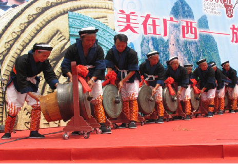 銅鼓舞,在廣西都安、巴馬、東蘭、馬山一帶的瑤族地區盛行。每年農歷五月二十九過“祝著節”(年節),要敲12天銅鼓,表示懷念祖宗和預祝豐收。節日隆重,聚眾數以千記。跳舞時,用銅鼓一對,其意一雌一雄,公聲小,母聲大。由兩男敲擊,兩男持雨帽回環擊鼓者扇搖,還有兩男兩女,應鼓樂節奏翩翩起舞,舞姿雄健優美,氣氛熱烈,十分感人。