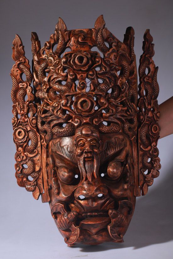 描述:程咬金,字義貞,原名咬金,后更名知節。驍勇善戰,歷史上是唐朝開國名將,以“三板斧”的形象在民間廣為流傳。在地戲唱本《薛仁貴征東》和《薛丁山征西》中,均有程咬金的出場。根據《隋唐演義》的內容,程咬金雖然頭腦簡單,卻是個有福之人,被認為是福將,所以在地戲面具的刻畫上,在嘴角兩側雕刻上一堆蝙蝠,以取“?!钡闹C音。又因為程咬金在唐代算是長壽之人,故爾額頭上刻一壽星,帶給人福壽雙全的吉祥含義。