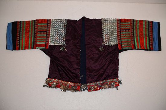 分布在臺江、施秉、鎮遠三縣交界地一帶苗族村寨,以臺江施洞苗族為代表。該服裝上衣為家織布右衽衣,刺繡主要在前襟、衣領、肩袖部分,以黔東南苗族特有的破線繡為主,所繡圖案主要為龍紋,工藝精美,具有民族特點。