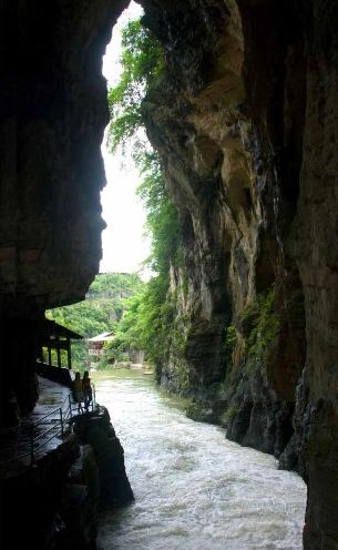 水洞長1000余米,半是人工半天然,登舟入洞,借助稀疏的燈光和導游的手電筒辨認著一處一處各各不同的景物,頗有一點神秘之感。洞盡船出,豁然開朗,但見茂竹修篁叢叢簇簇,一泓綠水微波不興,野趣天成,靜謐無聲,此處名“竹林翠溪”,宛如一世外桃源。旱洞共三層,滿布著形態各異的石鐘乳、石筍、石柱、石幔,其第三層洞廳軒敞,一座天然石橋飛架兩懸崖間,人稱“奈何橋”,橋下即是深不可測的陰潭,景觀之奇特,令人叫絕。旱洞出口處,有苗寨一座,是專為旅游者興建的,游人盡可在此親身體驗一次苗家的婚俗。